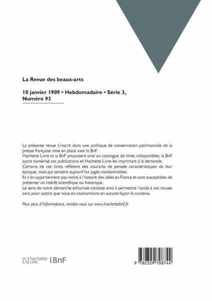 La Revue des beaux-arts: peinture, sculpture, architecture, gravure, musique, renseignements artistiques, expositions, concours: gazette hebdomadaire fondée en 1830 / dir. Henri Revers Date de l'édition originale: 1909-01-10 La présente revue s'inscrit dans une politique de conservation patrimoniale de la presse française mise en place avec la BnF. Hachette Livre et la BnF proposent ainsi un catalogue de titres indisponibles, la BnF ayant numérisé ces publications et Hachette Livre les imprimant à la demande. Certains de ces titres reflètent des courants de pensée caractéristiques de leur époque, mais qui seraient aujourd'hui jugés condamnables. Ils n'en appartiennent pas moins à l'histoire des idées en France et sont susceptibles de présenter un intérêt scientifique ou historique. Le sens de notre démarche éditoriale consiste ainsi à permettre l'accès à ces revues sans pour autant que nous en cautionnions en aucune façon le contenu. Pour plus d'informations, rendez-vous sur www.hachettebnf.fr