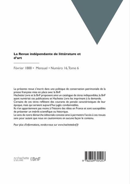La Revue indépendante de littérature et d'art / dir. Édouard Dujardin, Gabriel Martin; réd. en chef Félix Fénéon, puis Gustave Kahn; secrétaire de la rédaction Jean Ajalbert Date de l'édition originale: 1888-02 La présente revue s'inscrit dans une politique de conservation patrimoniale de la presse française mise en place avec la BnF. Hachette Livre et la BnF proposent ainsi un catalogue de titres indisponibles, la BnF ayant numérisé ces publications et Hachette Livre les imprimant à la demande. Certains de ces titres reflètent des courants de pensée caractéristiques de leur époque, mais qui seraient aujourd'hui jugés condamnables. Ils n'en appartiennent pas moins à l'histoire des idées en France et sont susceptibles de présenter un intérêt scientifique ou historique. Le sens de notre démarche éditoriale consiste ainsi à permettre l'accès à ces revues sans pour autant que nous en cautionnions en aucune façon le contenu. Pour plus d'informations, rendez-vous sur www.hachettebnf.fr