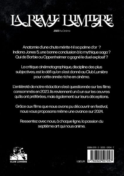 Anatomie d'une chute mérite-t-il sa palme d'or ? Indiana Jones 5, une bonne conclusion à la mythique saga ? Qui de Barbie ou Oppenheimer a gagné le duel explosif ?La critique cinématographique, discipline des plus subjectives, est le défi que l'on s'est donné au Club Lumière pour cette année riche en cinéma.L'entièreté de notre rédaction s'est questionnée sur les films consommés en 2023.Ils reviennent un à un sur les oeuvres qu'ils ont préférées, mais également sur leurs déceptions.Grâce aux films que nous avons pu découvrir en festival, nous vous proposons même une avance sur 2024.Ressentez avec nous, à chaque ligne, la passion du septième art qui nous anime.