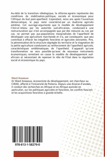 Au-delà de la transition idéologique, la réforme agraire représente des conditions de stabilisation politique, sociale et économique pour l'Afrique du Sud post-apartheid. Cependant, seize ans après l'ouverture démocratique, le pays reste caractérisé par un dualisme agricole extrême. Cet ouvrage argumente que le modèle de développement libéral retenu par les autorités sud-africaines, conduisant à une restructuration qui n'est accompagnée que par des mesures au cas par cas, ne permet pas aux populations marginalisées de l'apartheid de développer une agriculture marchande et n'a, par conséquent, que peu contribué à effacer les inégalités foncières et agricoles existantes. Pire, la pérennisation de la structure ségrégée du territoire et la stagnation de la petite agriculture conduisent au renforcement de l'apartheid agricole, caractéristiques emblématiques de l'apartheid. Il apparaît qu'une transformation ne sera possible qu'avec de nouveaux instruments économiques, remettant en cause le modèle de développement sud- africain et nécessitant de repenser le rôle de l'Etat dans la régulation social et économique du pays.