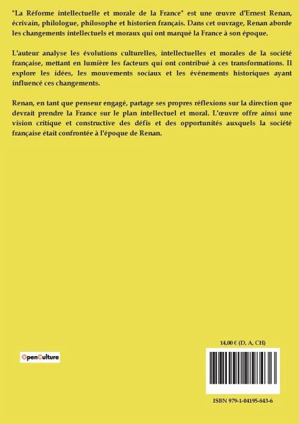 "La Réforme intellectuelle et morale de la France" est une ¿uvre d'Ernest Renan, écrivain, philologue, philosophe et historien français. Dans cet ouvrage, Renan aborde les changements intellectuels et moraux qui ont marqué la France à son époque. L'auteur analyse les évolutions culturelles, intellectuelles et morales de la société française, mettant en lumière les facteurs qui ont contribué à ces transformations. Il explore les idées, les mouvements sociaux et les événements historiques ayant influencé ces changements. Renan, en tant que penseur engagé, partage ses propres réflexions sur la direction que devrait prendre la France sur le plan intellectuel et moral. L'¿uvre offre ainsi une vision critique et constructive des défis et des opportunités auxquels la société française était confrontée à l'époque de Renan.