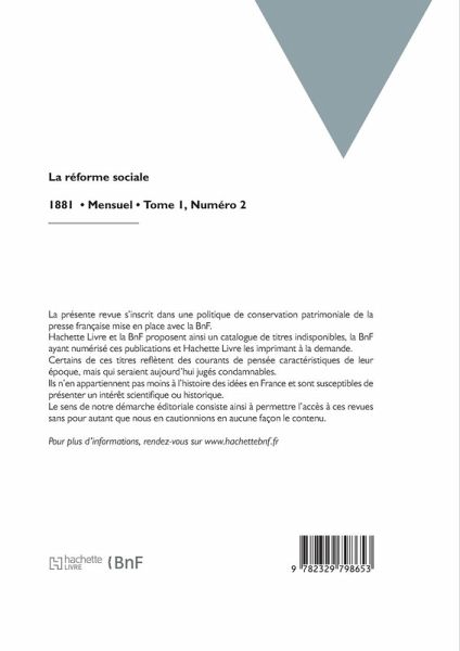 La Réforme sociale / publiée par un groupe d'économistes avec le concours de la Société d'économie sociale, de la Société bibliographique, des Unions de la paix sociale, et sous le patronage de M. F. Le Play; rédacteur en chef: M. Edmond Demolins Date de l'édition originale: 1881 La présente revue s'inscrit dans une politique de conservation patrimoniale de la presse française mise en place avec la BnF. Hachette Livre et la BnF proposent ainsi un catalogue de titres indisponibles, la BnF ayant numérisé ces publications et Hachette Livre les imprimant à la demande. Certains de ces titres reflètent des courants de pensée caractéristiques de leur époque, mais qui seraient aujourd'hui jugés condamnables. Ils n'en appartiennent pas moins à l'histoire des idées en France et sont susceptibles de présenter un intérêt scientifique ou historique. Le sens de notre démarche éditoriale consiste ainsi à permettre l'accès à ces revues sans pour autant que nous en cautionnions en aucune façon le contenu. Pour plus d'informations, rendez-vous sur www.hachettebnf.fr