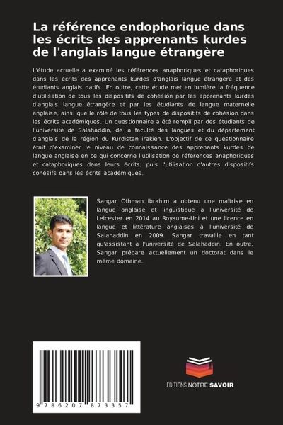 L'étude actuelle a examiné les références anaphoriques et cataphoriques dans les écrits des apprenants kurdes d'anglais langue étrangère et des étudiants anglais natifs. En outre, cette étude met en lumière la fréquence d'utilisation de tous les dispositifs de cohésion par les apprenants kurdes d'anglais langue étrangère et par les étudiants de langue maternelle anglaise, ainsi que le rôle de tous les types de dispositifs de cohésion dans les écrits académiques. Un questionnaire a été rempli par des étudiants de l'université de Salahaddin, de la faculté des langues et du département d'anglais de la région du Kurdistan irakien. L'objectif de ce questionnaire était d'examiner le niveau de connaissance des apprenants kurdes de langue anglaise en ce qui concerne l'utilisation de références anaphoriques et cataphoriques dans leurs écrits, puis l'utilisation d'autres dispositifs cohésifs dans les écrits académiques.