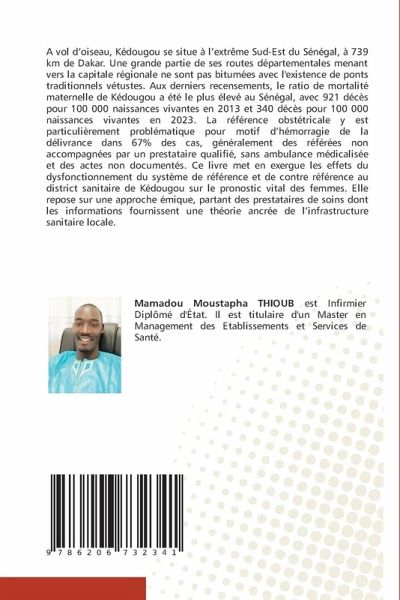 A vol d'oiseau, Kédougou se situe à l'extrême Sud-Est du Sénégal, à 739 km de Dakar. Une grande partie de ses routes départementales menant vers la capitale régionale ne sont pas bitumées avec l'existence de ponts traditionnels vétustes. Aux derniers recensements, le ratio de mortalité maternelle de Kédougou a été le plus élevé au Sénégal, avec 921 décès pour 100 000 naissances vivantes en 2013 et 340 décès pour 100 000 naissances vivantes en 2023. La référence obstétricale y est particulièrement problématique pour motif d'hémorragie de la délivrance dans 67% des cas, généralement des référées non accompagnées par un prestataire qualifié, sans ambulance médicalisée et des actes non documentés. Ce livre met en exergue les effets du dysfonctionnement du système de référence et de contre référence au district sanitaire de Kédougou sur le pronostic vital des femmes. Elle repose sur une approche émique, partant des prestataires de soins dont les informations fournissent une théorie ancrée de l'infrastructure sanitaire locale.
