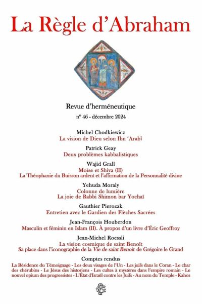 Fondée en 1996, La Règle d'Abraham est une revue annuelle française d'herméneutique principalement consacrée à l'étude des traditions ésotériques issues des trois révélations monothéistes: judaïsme, christianisme, islam. Pour autant, elle est aussi vouée à la connaissance approfondie de toutes les religions du monde. Son but est de favoriser une meilleure compréhension de celles-ci, mais également d'établir l'existence d'un véritable fond commun universel à partir de leur dimension intérieure, métaphysique, cosmologique et symbolique. Notre revue vise en ce sens le rétablissement d'une interprétation spirituelle du sacré en général, en opposition à toutes les formes de réductionnisme qu'elle critique. Elle fait appel à des spécialistes, universitaires le plus souvent ou indépendants. Nous publions des recherches originales inédites ainsi que des traductions de textes anciens et contemporains. Certains articles parus dans La Règle d'Abraham ont eux-mêmes été traduits et publiés en Espagne, en Italie et aux États-Unis. Au sommaire du numéro 46 (édition contenant plus de 60 images en noir et blanc): * Michel Chodkiewicz - La vision de Dieu selon Ibn 'Arabī * Patrick Geay - Deux problèmes kabbalistiques * Wajid Grall - Moïse et Shiva (II) - La Théophanie du Buisson ardent et l'affirmation de la Personnalité divine * Yehuda Moraly - La colonne de lumière - La joie de Rabbi Shimon bar Yochaï * Gauthier Pierozak - Entretien avec le Gardien des Flèches Sacrées * Jean-François Houberdon - Masculin et féminin en Islam (II) - À propos d'un livre d'Éric Geoffroy * Jean-Michel Roessli - La vision cosmique de saint Benoît au Monastère São Martinho de Tibães et ailleurs * Comptes rendus