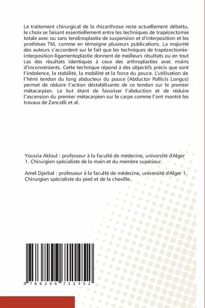 Le traitement chirurgical de la rhizarthrose reste actuellement débattu, le choix se faisant essentiellement entre les techniques de trapézectomie totale avec ou sans tendinoplastie de suspension et d'interposition et les prothèses TM, comme en témoigne plusieurs publications. La majorité des auteurs s'accordent sur le fait que les techniques de trapézectomie-interposition-ligamentoplastie donnent de meilleurs résultats ou en tout cas des résultats identiques à ceux des arthroplasties avec moins d'inconvénients. Cette technique répond à des objectifs précis que sont l'indolence, la stabilité, la mobilité et la force du pouce. L'utilisation de l'hémi tendon du long abducteur du pouce (Abductor Pollicis Longus) permet de réduire l'action déstabilisante de ce tendon sur le premier métacarpien. Le but étant de favoriser l'abduction et de réduire l'ascension du premier métacarpien sur le carpe comme l'ont montré les travaux de Zancolli et al.