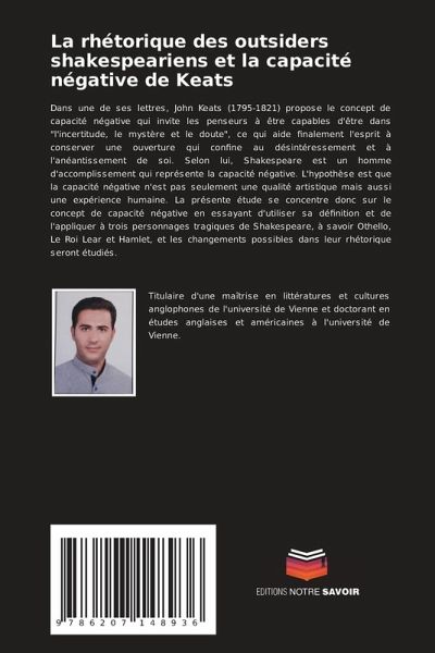 Dans une de ses lettres, John Keats (1795-1821) propose le concept de capacité négative qui invite les penseurs à être capables d'être dans "l'incertitude, le mystère et le doute", ce qui aide finalement l'esprit à conserver une ouverture qui confine au désintéressement et à l'anéantissement de soi. Selon lui, Shakespeare est un homme d'accomplissement qui représente la capacité négative. L'hypothèse est que la capacité négative n'est pas seulement une qualité artistique mais aussi une expérience humaine. La présente étude se concentre donc sur le concept de capacité négative en essayant d'utiliser sa définition et de l'appliquer à trois personnages tragiques de Shakespeare, à savoir Othello, Le Roi Lear et Hamlet, et les changements possibles dans leur rhétorique seront étudiés.