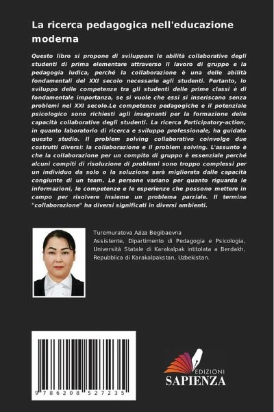 Questo libro si propone di sviluppare le abilità collaborative degli studenti di prima elementare attraverso il lavoro di gruppo e la pedagogia ludica, perché la collaborazione è una delle abilità fondamentali del XXI secolo necessarie agli studenti. Pertanto, lo sviluppo delle competenze tra gli studenti delle prime classi è di fondamentale importanza, se si vuole che essi si inseriscano senza problemi nel XXI secolo.Le competenze pedagogiche e il potenziale psicologico sono richiesti agli insegnanti per la formazione delle capacità collaborative degli studenti. La ricerca Part¿c¿patory-act¿on, in quanto laboratorio di ricerca e sviluppo profess¿onale, ha guidato questo studio. Il problem solving collaborativo coinvolge due costrutti diversi: la collaborazione e il problem solving. L'assunto è che la collaborazione per un compito di gruppo è essenziale perché alcuni compiti di risoluzione di problemi sono troppo complessi per un individuo da solo o la soluzione sarà migliorata dalle capacità congiunte di un team. Le persone variano per quanto riguarda le informazioni, le competenze e le esperienze che possono mettere in campo per risolvere insieme un problema parziale. Il termine "collaborazione" ha diversi significati in diversi ambienti.