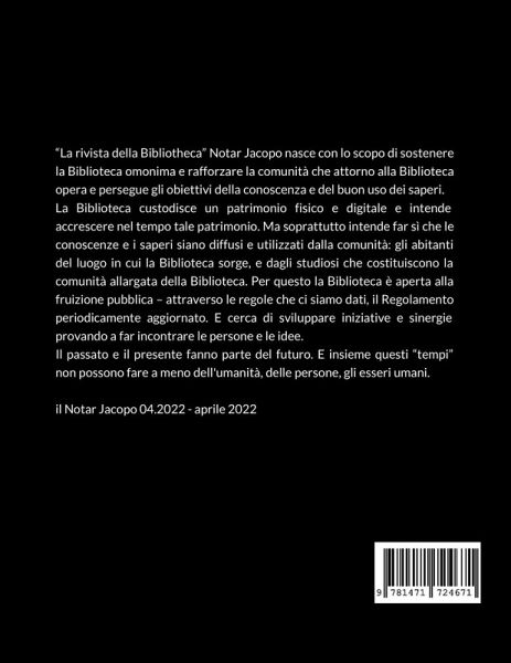 "La rivista della Bibliotheca" il Notar Jacopo nasce con lo scopo di sostenere la Biblioteca omonima e rafforzare la comunità che attorno alla Biblioteca opera e persegue gli obiettivi della conoscenza e del buon uso dei saperi. La Biblioteca custodisce un patrimonio fisico e digitale e intende accrescere nel tempo tale patrimonio. Ma soprattutto intende far sì che le conoscenze e i saperi siano diffusi e utilizzati dalla comunità: gli abitanti del luogo in cui la Biblioteca sorge, e dagli studiosi che costituiscono la comunità allargata della Biblioteca. Per questo la Biblioteca è aperta alla fruizione pubblica - attraverso le regole che ci siamo dati, il Regolamento periodicamente aggiornato. E cerca di sviluppare iniziative e sinergie provando a far incontrare le persone e le idee. Il passato e il presente fanno parte del futuro. E insieme questi "tempi" non possono fare a meno dell'umanità, delle persone, gli esseri umani. il Notar Jacopo - Numero 04.2022 - aprile 2022