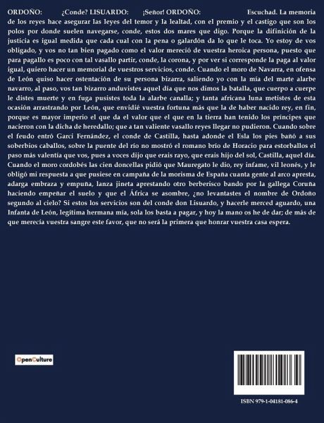 ORDOÑO: ¿Conde? LISUARDO: ¡Señor! ORDOÑO: Escuchad. La memoria de los reyes hace asegurar las leyes del temor y la lealtad, con el premio y el castigo que son los polos por donde suelen navegarse, conde, estos dos mares que digo. Porque la difinición de la justicia es igual medida que cada cual con la pena o galardón da lo que le toca. Yo estoy de vos obligado, y vos no tan bien pagado como el valor mereció de vuestra heroica persona, puesto que para pagallo es poco con tal vasallo partir, conde, la corona, y por ver si corresponde la paga al valor igual, quiero hacer un memorial de vuestros servicios, conde. Cuando el moro de Navarra, en ofensa de León quiso hacer ostentación de su persona bizarra, saliendo yo con la mía del marte alarbe navarro, al paso, vos tan bizarro anduvistes aquel día que nos dimos la batalla, que cuerpo a cuerpe le distes muerte y en fuga pusistes toda la alarbe canalla; y tanta africana luna metistes de esta ocasión arrastrando por León, que envidié vuestra fortuna más que la de haber nacido rey, en fin, porque es mayor imperio el que da el valor que el que en la tierra han tenido los príncipes que nacieron con la dicha de heredallo; que a tan valiente vasallo reyes llegar no pudieron. Cuando sobre el feudo entró Garci Fernández, el conde de Castilla, hasta adonde el Esla los pies bañó a sus soberbios caballos, sobre la puente del río no mostró el romano brío de Horacio para estorballos el paso más valentía que vos, pues a voces dijo que erais rayo, que erais hijo del sol, Castilla, aquel día. Cuando el moro cordobés las cien doncellas pidió que Mauregato le dio, rey infame, vil leonés, y le obligó mi respuesta a que pusiese en campaña de la morisma de España cuanta gente al arco apresta, adarga embraza y empuña, lanza jineta aprestando otro berberisco bando por la gallega Coruña haciendo empeñar el suelo y que el África se asombre, ¿no levantastes el nombre de Ordoño segundo al cielo? Si estos los servicios son del conde don Lisuardo, y hacerle merced aguardo, una Infanta de León, legítima hermana mía, sola los basta a pagar, y hoy la mano os he de dar; de más de que merecía vuestra sangre este favor, que no será la primera que honrar vuestra casa espera.