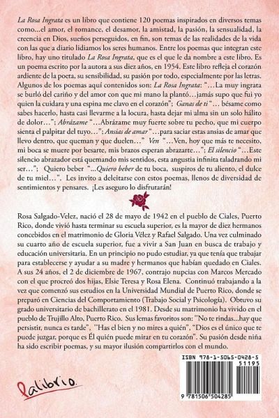 La Rosa Ingrata es un libro que contiene 120 poemas inspirados en diversos temas como...el amor, el romance, el desamor, la amistad, la pasión, la sensualidad, la creencia en Dios, sueños perseguidos, en fin, son temas de las realidades de la vida con las que a diario lidiamos los seres humanos. Entre los poemas que integran este libro, hay uno titulado La Rosa Ingrata, que es el que le da nombre a este libro. Es un poema escrito por la autora a sus diez años, en 1954. Este libro refleja el corazón ardiente de la poeta, su sensibilidad, su pasión por todo, especialmente por las letras. Algunos de los poemas aquí contenidos son: La Rosa Ingrata: "...La muy ingrata se burló del cariño y del amor con que mi mano la plantó...jamás supo que fui yo quien la cuidara y una espina me clavo en el corazón"; Ganas de ti "... bésame como sabes hacerlo, hasta casi llevarme a la locura, hasta dejar mi alma sin un solo hálito de dolor..."; Abrázame "...Abrázame muy fuerte sobre tu pecho, que mi cuerpo sienta el palpitar del tuyo..."; Ansias de amar "...para saciar estas ansias de amar que llevo dentro, que queman y que duelen..." Ven "...Ven, hoy que más te necesito, mi boca se muere por besarte, mis brazos esperan abrazarte..."; El silencio "...Este silencio abrazador está quemando mis sentidos, esta angustia infinita taladrando mi ser..."; Quiero beber "...Quiero beber de tu boca, suspiros de tu aliento, el dulce de tu miel...". Les invito a deleitarse con estos poemas, llenos de diversidad de sentimientos y pensares. ¡Les aseguro lo disfrutarán!