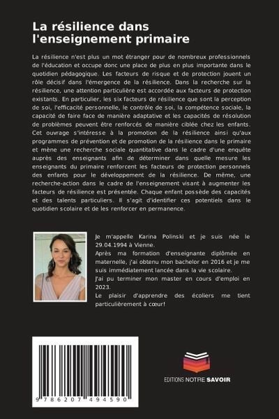 La résilience n'est plus un mot étranger pour de nombreux professionnels de l'éducation et occupe donc une place de plus en plus importante dans le quotidien pédagogique. Les facteurs de risque et de protection jouent un rôle décisif dans l'émergence de la résilience. Dans la recherche sur la résilience, une attention particulière est accordée aux facteurs de protection existants. En particulier, les six facteurs de résilience que sont la perception de soi, l'efficacité personnelle, le contrôle de soi, la compétence sociale, la capacité de faire face de manière adaptative et les capacités de résolution de problèmes peuvent être renforcés de manière ciblée chez les enfants. Cet ouvrage s'intéresse à la promotion de la résilience ainsi qu'aux programmes de prévention et de promotion de la résilience dans le primaire et mène une recherche sociale quantitative dans le cadre d'une enquête auprès des enseignants afin de déterminer dans quelle mesure les enseignants du primaire renforcent les facteurs de protection personnels des enfants pour le développement de la résilience. De même, une recherche-action dans le cadre de l'enseignement visant à augmenter les facteurs de résilience est présentée. Chaque enfant possède des capacités et des talents particuliers. Il s'agit d'identifier ces potentiels dans le quotidien scolaire et de les renforcer en permanence.