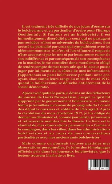 Illustré d'une carte, 15 portraits et 28 illustrations. Contenant que des ouvrages irréprochables pouvant être mis dans toutes les mains. Voir catalogue joint pour toutes nos publications sur Lulu.com ____________ Il est vraiment très difficile de nos jours d'écrire sur le bolchevisme et en particulier d'écrire pour l'Europe Occidentale. Si l'auteur est un bolcheviste, il est immédiatement discrédité par ceux qui ne partagent pas ses idées¿; s'il est un adversaire du bolchevisme, il est accusé de partialité par ceux qui sympathisent avec les idées communistes¿; s'il n'est ni l'un ni l'autre, il risque de n'être accepté ni par les uns ni par les autres en raison de son indifférence et par conséquent de son incompétence en la matière. Je me considère donc moralement obligé de rendre compte de mes¿titres, afin que le lecteur puisse juger par lui¿même de la sûreté de mes informations. J'appartenais au parti bolcheviste pendant onze ans, ayant abandonné leurs rangs au mois de mars 1917, quand le bolchevisme se¿détacha entièrement de la social¿démocratie. Après avoir quitté le parti, je devins un des rédacteurs du journal de Gorki Novaya Gisn, jusqu'à ce qu'il fût supprimé par le gouvernement bolcheviste¿; en même temps je travaillais au bureau de propagande du Conseil des députés ouvriers et soldats de Pétrograd. Après la révolution du mois d'octobre¿1917, je fus obligé de donner ma démission et, comme journaliste, je traversais et retraversais maintes fois la Russie. Ce livre est le résultat de mes observations personnelles à l'armée, à la campagne, dans les villes, dans les administrations bolchevistes et au cours de mes¿conversations particulières avec mes anciens amis bolchevistes. J'y joins des témoignages officiels pris dans les journaux bolchevistes. (voir Appendice.) Table des matières Au seuil du bolchevisme - Le septième cercle - Les morts vivants - Les hommes au gouvernail de l'état - Le pape noir du bolchevisme - Le soutien de la terreur - Le système des soviets¿ - L'administration bolcheviste - Comité central de ravitaillement - Conseil principal de l'organisation économique nationale - Comité supérieur pour procurer le combustible - Comité central de l'industrie textile - Comité central d'industrie métallurgique - Comité central de logement - Le bolchevisme et la classe ouvrière - Leur justice - À la campagne - Les nouveaux riches - Les paysans et les ouvriers - Une conversation - Appendice - Quelques leçons pratiques de politique.