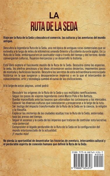 Viaje por la Ruta de la Seda y descubra el comercio, las culturas y las aventuras del mundo antiguo. Descubra la legendaria Ruta de la Seda, una red épica de antiguas rutas comerciales que se extendía a lo largo de miles de kilómetros uniendo Oriente y Occidente durante siglos. En La Ruta de la Seda, embárquese en un cautivador viaje a través del tiempo y del terreno, donde convergieron culturas, fluyeron mercancías y se desarrolló la historia. Este libro explora el fascinante mundo de la Ruta de la Seda. Descubra cómo las especias, la seda, las piedras preciosas y las ideas atravesaron vastos desiertos, imponentes pasos de montaña y bulliciosos bazares. Descubra los secretos de esta extraordinaria encrucijada histórica en la que surgieron y desaparecieron imperios y en la que el intercambio de conocimientos, arte y tecnología cambió el curso de las civilizaciones. A lo largo de estas páginas, usted podrá: Descubrir los orígenes de la Ruta de la Seda y sus múltiples ramificaciones. Seguir los pasos de viajeros legendarios como Marco Polo e Ibn Battuta. Quedar maravillado ante los tesoros que adornaban los caravasares y los mercados. Conocer las diversas culturas que coexistieron y prosperaron a lo largo de la ruta. Ser testigo del impacto transformador de la Ruta de la Seda en la ciencia, la religión y la filosofía. Explorar los misterios de las ciudades ocultas tras la Ruta de la Seda, enterradas bajo las arenas del tiempo. Seguir el ascenso y la caída de los imperios que trataron de controlar esta lucrativa ruta comercial. Comprender el legado perdurable de la Ruta de la Seda en la configuración del mundo interconectado de la actualidad. ¡Y mucho más!