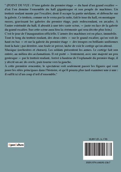 " (POINT DE VUE : D¿une galerie du premier étage ¿ du haut d¿un grand escalier ¿ d¿où l¿on domine l¿ensemble du hall gigantesque et son peuple de machines. Un trottoir roulant monte par l¿escalier, dont il occupe la partie médiane, et débouche sur la galerie. Ce trottoir, comme on le verra par la suite, fait le tour du hall, en montagne russes, gravissant les galeries du premier étage, puis redescendant, en arcades. À l¿autre extrémité du hall, il aboutit à une très vaste scène, ¿ juste en face de la galerie du grand escalier. Sur cette scène aura lieu la cérémonie qui sera décrite plus loin.) C¿est le jour de l¿inauguration officielle. L¿armée des machines est en place, immobile. Tout le long du trottoir roulant, des deux côtés ¿ sur le grand escalier, qüon voit de haut en bas ¿ et sur la galerie du premier étage ¿ des troupes en brillants uniformes font la haie ; par derrière, une foule se presse, tâche de voir le cortège qüon attend. Musique (orchestres et ch¿urs). Les soldats présentent les armes. Le cortège fait son entrée, au milieu des acclamations. Il est porté ¿ lentement, avec une majesté un peu grotesque ¿ par le trottoir roulant. Arrivé à hauteur de l¿esplanade du premier étage, il y décrit un arc de cercle, puis tourne vers la gauche. À cette première rencontre, le spectateur voit seulement passer les figures qui vont jouer les rôles principaux dans l¿histoire, et qüil pourra plus tard examiner une à une : il suffit ici d¿un coup d¿¿il d¿ensemble."