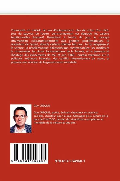 L'humanité est malade de son développement: plus de riches d'un côté, plus de pauvres de l'autre. L'environnement est dégradé, les valeurs traditionnelles éclatent! Remettant à l'ordre du jour le concept d'humanisme caricaturé,confronté aux grandes problématiques, la révolution de l'esprit, aborde certains thèmes tels que : la foi religieuse et la science, la problématique philosophique contemporaine, les médias et la citoyenneté, les droits fondamentaux de la femme, et la jeunesse et l'héritage des événements de mai et juin 1968. L'auteur,s'exprime sur la politique intérieure française, des conflits internationaux en cours, et propose une révision de la gouvernance mondiale.