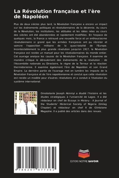 Plus de deux siècles plus tard, la Révolution française a encore un impact sur les événements politiques et révolutionnaires de la décennie. Au cours de la Révolution, les institutions, les attitudes et les idées nées au cours des siècles ont été abandonnées et rapidement modifiées. En l'espace de quelques mois, la France a retrouvé une nouvelle force et un enthousiasme révolutionnaire si grand que les armées françaises ont pu résister et vaincre l'opposition militaire de la quasi-totalité de l'Europe. Incontestablement la plus grande révolution jusqu'en 1917, la Révolution française est restée un manuel pour les révolutionnaires du monde entier. Cet ouvrage analyse les causes de la Révolution française. Il examine de manière critique le déroulement des événements de la révolution : de l'Assemblée nationale au Directoire, le règne de la Terreur et la réaction thermidorienne. Il examine également l'ère de Napoléon et son Grand Empire. La dernière partie de l'ouvrage met en lumière les impacts de la Révolution française et de l'ère napoléonienne et conclut que cette révolution est restée un modèle pour d'autres révolutions et a conduit à l'évolution du système international.