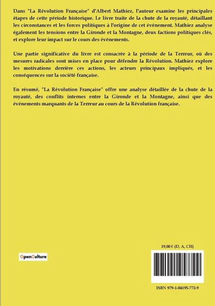 Dans "La Révolution Française" d'Albert Mathiez, l'auteur examine les principales étapes de cette période historique. Le livre traite de la chute de la royauté, détaillant les circonstances et les forces politiques à l'origine de cet événement. Mathiez analyse également les tensions entre la Gironde et la Montagne, deux factions politiques clés, et explore leur impact sur le cours des événements. Une partie significative du livre est consacrée à la période de la Terreur, où des mesures radicales sont mises en place pour défendre la Révolution. Mathiez explore les motivations derrière ces actions, les acteurs principaux impliqués, et les conséquences sur la société française. "La Révolution Française" offre une analyse détaillée de la chute de la royauté, des conflits internes entre la Gironde et la Montagne, ainsi que des événements marquants de la Terreur au cours de la Révolution française.
