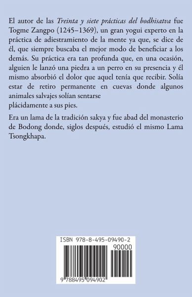 El autor de las Treinta y siete prácticas del bodhisatva fue Togme Zangpo (1245-1369), un gran yogui experto en la práctica de adiestramiento de la mente ya que, se dice de él, que siempre buscaba el mejor modo de beneficiar a los demás. Su práctica era tan profunda que, en una ocasión, alguien le lanzó una piedra a un perro en su presencia y él mismo absorbió el dolor que aquel tenía que recibir. Solía estar de retiro permanente en cuevas donde algunos animales salvajes solían sentarse plácidamente a sus pies. Era un lama de la tradición sakya y fue abad del monasterio de Bodong donde, siglos después, estudió el mismo Lama Tsongkhapa.
