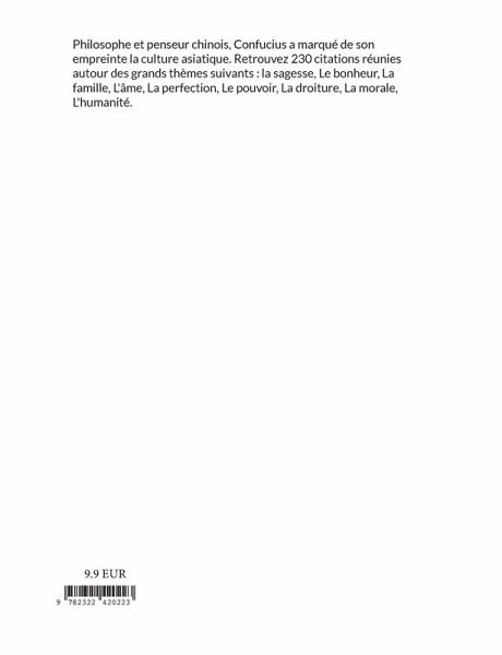 Philosophe et penseur chinois, Confucius a marqué de son empreinte la culture asiatique. Retrouvez 230 citations réunies autour des grands thèmes suivants : la sagesse, Le bonheur, La famille, L'âme, La perfection, Le pouvoir, La droiture, La morale, L'humanité. Confucius séduit par sa bonne humeur, sa générosité, sa bonhomie, et réussit à concilier la vigueur des principes moraux et les faiblesses des humains. Ce petit livre propose un art de vivre qui demeure un modèle pour le monde moderne.