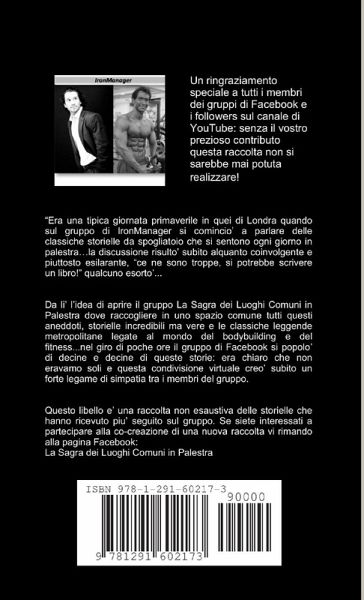 "Era una tipica giornata primaverile in quei di Londra quando sul gruppo di IronManager si comincio' a parlare delle classiche storielle da spogliatoio che si sentono ogni giorno in palestra...la discussione risulto' subito alquanto coinvolgente e piuttosto esilarante, "ce ne sono troppe, si potrebbe scrivere un libro!" qualcuno esorto'... Da li' l'idea di aprire il gruppo La Sagra dei Luoghi Comuni in Palestra dove raccogliere in uno spazio comune tutti questi aneddoti, storielle incredibili ma vere e le classiche leggende metropolitane legate al mondo del bodybuilding e del fitness...nel giro di poche ore il gruppo di Facebook si popolo' di decine e decine di queste storie: era chiaro che non eravamo soli e questa condivisione virtuale creo' subito un forte legame di simpatia tra i membri del gruppo. Questo libello e' una raccolta non esaustiva delle storielle che hanno ricevuto piu' seguito sul gruppo. Fran (a.k.a. IronManager)