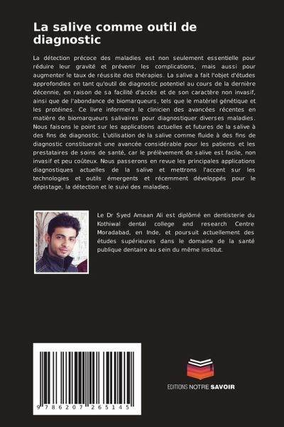 La détection précoce des maladies est non seulement essentielle pour réduire leur gravité et prévenir les complications, mais aussi pour augmenter le taux de réussite des thérapies. La salive a fait l'objet d'études approfondies en tant qu'outil de diagnostic potentiel au cours de la dernière décennie, en raison de sa facilité d'accès et de son caractère non invasif, ainsi que de l'abondance de biomarqueurs, tels que le matériel génétique et les protéines. Ce livre informera le clinicien des avancées récentes en matière de biomarqueurs salivaires pour diagnostiquer diverses maladies. Nous faisons le point sur les applications actuelles et futures de la salive à des fins de diagnostic. L'utilisation de la salive comme fluide à des fins de diagnostic constituerait une avancée considérable pour les patients et les prestataires de soins de santé, car le prélèvement de salive est facile, non invasif et peu coûteux. Nous passerons en revue les principales applications diagnostiques actuelles de la salive et mettrons l'accent sur les technologies et outils émergents et récemment développés pour le dépistage, la détection et le suivi des maladies.