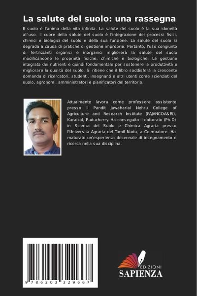 Il suolo è l'anima della vita infinita. La salute del suolo è la sua idoneità all'uso. Il cuore della salute del suolo è l'integrazione dei processi fisici, chimici e biologici del suolo e della sua funzione. La salute del suolo si degrada a causa di pratiche di gestione improprie. Pertanto, l'uso congiunto di fertilizzanti organici e inorganici migliorerà la salute del suolo modificandone le proprietà fisiche, chimiche e biologiche. La gestione integrata dei nutrienti è quindi fondamentale per sostenere la produttività e migliorare la qualità del suolo. Si ritiene che il libro soddisferà la crescente domanda di ricercatori, studenti, insegnanti e altri utenti come scienziati del suolo, agronomi, amministratori e pianificatori del territorio.