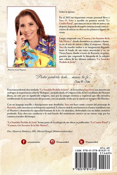 Tras un viaje multidimensional a través del tiempo y después de varios encuentros y experiencias supernaturales, Razziela descubre que en su destino está custodiar "La Sandalia Perdida de Jesús", reliquia que fue arrojada desde el Gólgota el día de su crucifixión. Esta fantástica aventura nos invita a caminar entre lo real y lo imaginario. Dios escribe derecho en renglones torcidos y, buscando respuestas, Razziela encuentra "la sandalia perdida" y con ella a su dueño.
