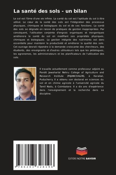 Le sol est l'âme d'une vie infinie. La santé du sol est l'aptitude du sol à être utilisé. Le coeur de la santé des sols est l'intégration des processus physiques, chimiques et biologiques du sol et de ses fonctions. La santé des sols se dégrade en raison de pratiques de gestion inappropriées. Par conséquent, l'utilisation conjointe d'engrais organiques et inorganiques améliorera la santé du sol en modifiant ses propriétés physiques, chimiques et biologiques. La gestion intégrée des nutriments est donc essentielle pour maintenir la productivité et améliorer la qualité des sols. Cet ouvrage devrait répondre à la demande croissante des chercheurs, des étudiants, des enseignants et d'autres utilisateurs tels que les pédologues, les agronomes, les administrateurs et les planificateurs de l'utilisation des sols.