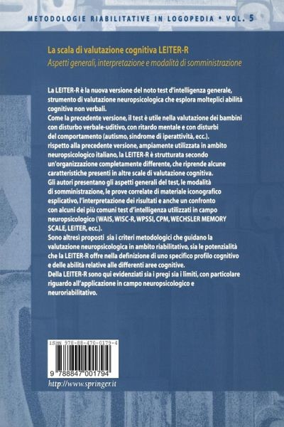 Rispetto alla precedente versione, ampiamente utilizzata in ambito neuropsicologico italiano, la LEITER-R è strutturata secondo una organizzazione completamente differente, che riprende alcune caratteristiche presenti in altre scale di valutazione cognitiva. Gli autori presentano gli aspetti generali del test, le modalità di somministrazione, le prove correlate di materiale iconografico esplicativo, l'interpretazione dei risultati e anche un confronto con alcuni dei più comuni test d'intelligenza utilizzati in campo neuropsicologico (WAIS, WISC-R, EPSSI, CPM, WECHSLER MEMORY SCALE, LEITER, etc.).