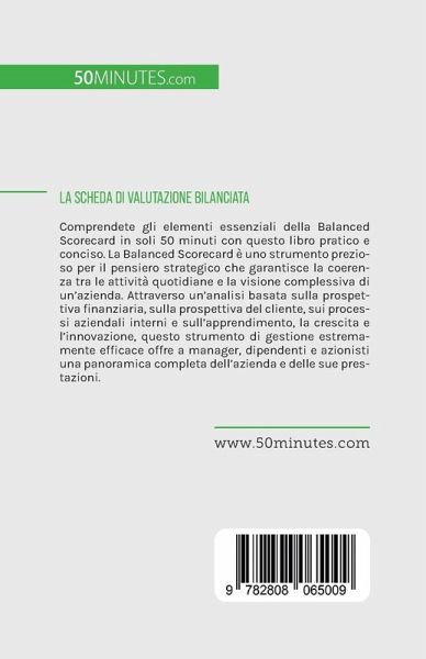 Comprendete gli elementi essenziali della Balanced Scorecard in soli 50 minuti con questo libro pratico e conciso. La Balanced Scorecard è uno strumento prezioso per il pensiero strategico che garantisce la coerenza tra le attività quotidiane e la visione complessiva di un'azienda. Attraverso un'analisi basata sulla prospettiva finanziaria, sulla prospettiva del cliente, sui processi aziendali interni e sull'apprendimento, la crescita e l'innovazione, questo strumento di gestione estremamente efficace offre a manager, dipendenti e azionisti una panoramica completa dell'azienda e delle sue prestazioni. Questo libro vi fornirà una pratica introduzione agli indicatori di mezzi e di performance legati alla Balanced Scorecard, tra cui la quota di mercato, la fedeltà dei clienti e la soddisfazione dei dipendenti. Inoltre, contiene consigli pratici per l'implementazione dello strumento, una descrizione dei suoi principali vantaggi e svantaggi, tra cui l'incapacità di integrare pienamente l'ambiente esterno, e una discussione approfondita di un caso di studio. Informazioni sulla Balanced Scorecard: La Balanced Scorecard combina strategia e gestione e utilizza una serie di indicatori di performance per fornire una visione completa degli obiettivi e delle tattiche a breve e lungo termine di un'azienda. A differenza dei sistemi precedenti, che tendevano a essere meno dinamici e a basarsi su informazioni vecchie, la Balanced Scorecard tiene conto degli indicatori operativi, dei clienti e delle persone per fornire una valutazione molto più approfondita dell'azienda. In questo libro scoprirete come la Balanced Scorecard può aiutare la vostra azienda, conoscerete le diverse componenti del modello e comprenderete i numerosi indicatori coinvolti. Una chiara spiegazione dei vantaggi e dei potenziali svantaggi del metodo, la discussione di un caso pratico e una serie di consigli pratici vi forniranno gli strumenti necessari per adattare l'approccio alla vostra situazione.