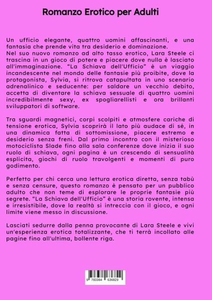 Un ufficio elegante, quattro uomini affascinanti, e una fantasia che prende vita tra desiderio e dominazione.Nel suo nuovo romanzo ad alto tasso erotico, Lara Steele ci trascina in un gioco di potere e piacere dove nulla è lasciato all'immaginazione. "La Schiava dell'Ufficio" è un viaggio incandescente nel mondo delle fantasie più proibite, dove la protagonista, Sylvia, si ritrova catapultata in uno scenario adrenalinico e seducente: per saldare un vecchio debito, accetta di diventare la schiava sessuale di quattro uomini incredibilmente sexy, ex spogliarellisti e ora brillanti sviluppatori di software.Tra sguardi magnetici, corpi scolpiti e atmosfere cariche di tensione erotica, Sylvia scoprirà il lato più audace di sé, in una dinamica fatta di sottomissione, piacere estremo e desiderio senza freni. Dal primo incontro con il misterioso motociclista Slade fino alla sala conferenze dove inizia il suo ruolo di schiava, ogni pagina è un crescendo di sensualità esplicita, giochi di ruolo travolgenti e momenti di puro godimento.Perfetto per chi cerca una lettura erotica diretta, senza tabù e senza censure, questo romanzo è pensato per un pubblico adulto che non teme di esplorare le proprie fantasie più segrete. "La Schiava dell'Ufficio" è una storia rovente, intensa e irresistibile, dove la realtà si intreccia con il gioco, e ogni limite viene messo in discussione.Lasciati sedurre dalla penna provocante di Lara Steele e vivi un'esperienza erotica totalizzante, che ti terrà incollato alle pagine fino all'ultima, bollente riga.