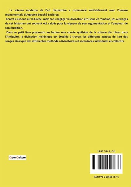 La science moderne de l'art divinatoire a commencé véritablement avec l'oeuvre monumentale d'Auguste Bouché-Leclercq. Centrés surtout sur la Grèce, mais sans négliger la divination étrusque et romaine, les ouvrages de cet historien ont souvent été salués pour la vigueur de son argumentation et l'ampleur de son érudition. Dans ce petit livre proposant au lecteur une courte synthèse de la science des rêves dans l'Antiquité, la divination hellénique est étudiée à travers les différents aspects de l'art des songes ainsi que des différentes méthodes divinatoires et sacerdoces individuels et collectifs.