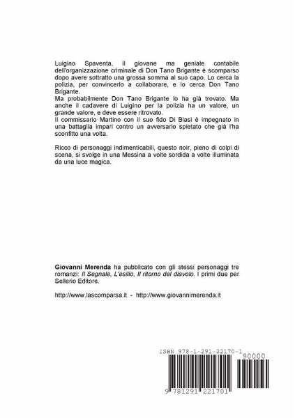 Luigino Spaventa, il giovane ma geniale contabile dell'organizzazione criminale di don Tano Brigante è scomparso dopo avere sottratto una grossa somma al suo capo. Lo cerca la polizia, per convincerlo a collaborare, e lo cerca Don Tano Brigante. Il commissario Martino con il suo fido Di Blasi è impegnato in una battaglia impari contro un avversario spietato che già l'ha sconfitto una volta. Ricco di personaggi indimenticabili questo noir, pieno di colpi di scena, si svolge in una Messina a volte sordida a volte illuminata da una luce magica. Le prime due storie del commissario Martino sono state pubblicate da Sellerio editore.