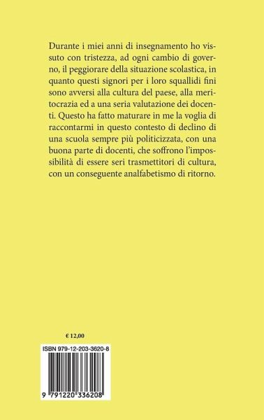 Durante i miei anni di insegnamento ho vissuto, con tristezza, ad ogni cambio di governo il peggiorare della situazione scolastica in quanto questi signori per i loro squallidi fini sono avversi alla cultura del paese e alla meritocrazia, quindi ad una seria valutazione dei docenti. Questo ha fatto maturare in me la voglia di raccontarmi in questo contesto di declino di una scuola sempre più politicizzata, con una buona parte di docenti che soffrono l'impossibilità di essere seri trasmettitori di cultura e con un conseguente analfabetismo di ritorno.