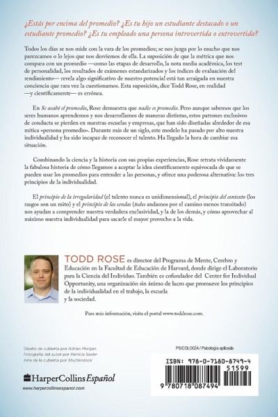 Combinando la ciencia y la historia con sus propias experiencias, Rose trae a la vida la historia sin narrar de c¿¿mo llegamos a aceptar la idea cient¿¿ficamente equivocada de que se pueden usar los promedios para entender a las personas, y ofrece una poderosa alternativa: los tres principios de individualidad. ¿¿Est¿¿s por encima del promedio? ¿¿Es tu hijo un estudiante de primer nivel? ¿¿Es tu empleado una persona introvertida o extrovertida? Todos los d¿¿as se nos mide con la vara de los promedios; se nos juzga por lo cercanos o lejanos que estamos a ella. La suposici¿¿n de que una medida que nos compara con el promedio, como los escalones en el desarrollo, las pruebas de personalidad, los resultados estandarizados de ex¿¿menes y las evaluaciones de desempe¿¿o, revela algo significativo en cuanto a nuestro potencial se encuentra tan grabado en nuestra conciencia, que pocas veces lo cuestionamos. Todd Rose nos dice que esa suposici¿¿n es espectacular y cient¿¿ficamente, err¿¿nea. En este libro, Rose demuestra que nadie es promedio. Pero aunque sabemos que los seres humanos aprendemos y nos desarrollamos de maneras distintas, estos patrones exclusivos de conducta se pierden en nuestras escuelas y empresas, que han sido dise¿¿adas alrededor de esa m¿¿tica ¿¿persona promediö¿. Durante m¿¿s de un siglo, este modelo ha pasado por alto nuestra individualidad y ha sido incapaz de reconocer el talento. Ha llegado la hora de cambiar esa situaci¿¿n. Combinando la ciencia y la historia con sus propias experiencias, Rose trae a la vida la historia sin narrar de c¿¿mo llegamos a aceptar la idea cient¿¿ficamente equivocada de que se pueden usar los promedios para entender a las personas, y ofrece una poderosa alternativa: los tres principios de individualidad. El principio de la irregularidad (el talento nunca es unidimensional), el principio del contexto (los rasgos son un mito) y el principio de las sendas (todos andamos por el camino menos recorrido) nos ayudan a comprender nuestra verdadera exclusividad, y la de los dem¿¿s, y c¿¿mo aprovechar al m¿¿ximo nuestra individualidad para tener una ventaja en la vida. Are you above average? Is your child an A (or a C) student? Is your employee an introvert or an extrovert? Every day we are measured against the yardstick of averages, judged according to how closely we resemble it or how far we deviate from it. The assumption that metrics comparing us to an average--like development milestones, GPAs, personality assessments, standardized test results, and performance review ratings--reveal something meaningful about our potential is so ingrained in our consciousness that we rarely question it. That assumption, says Harvard's Todd Rose, is spectacularly--and scientifically--wrong. In The End of Average, Rose shows that no one is average. Not you. Not your kids. Not your employees or students. This isn't hollow sloganeering-- it's a mathematical fact with enormous practical consequences. But while we know people learn and develop in distinctive ways, these unique patterns of behaviors are lost in our schools and businesses, which have been designed around the mythical "average person." For more than a century, this average-size-fits-all model has ignored our individuality and failed at recognizing talent. It's time to change that.
