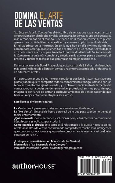 DOMINA EL ARTE DE LAS VENTAS "La Secuencia de la Compra" es el único libro de ventas que vas a necesitar para ser profesional en el más alto nivel de la industria, las ventas es uno de los trabajos más remunerados en el mundo, si se hacen de la manera correcta, te puede generar una cantidad ilimitada de dinero y con eso ampliar tu estilo de vida. En el laberinto de la información en la que hoy en día vivimos donde los compradores escrupulosos tienen todo al alcance de un "botón" el verdadero arte de la venta es crucial para tu éxito. El contenido dentro de La Secuencia de la Compra es la guía más completa y efectiva en la que ves paso a paso todo el proceso y aprendes técnicas que garantizan tu mejor desempeño. Durante la carrera de David Fitzgerald que abarca más de 33 años ha influenciado más de mil millones de dólares en ventas y ha entrenado a miles de profesionales en diferentes niveles. Él ha probado ser uno de los mejores cerradores que jamás hayan levantado una pluma y ahora quiere compartir todo su conocimiento contigo. Armado con las técnicas más efectivas jamás creadas, y un claro entendimiento de la mente del comprador, vas a poder vender en un nivel profesional en muy poco tiempo. Imagina la confianza de entrar a cualquier ambiente de ventas sabiendo que tienes el mejor entrenamiento para ser exitoso. Este libro se divide en 4 partes: La Venta: Los 9 pasos esenciales en un formato sencillo de seguir. La "No Venta": Un análisis ligero pero real de lo que pasa cuando no tienes el mejor entrenamiento. ¿Qué salió mal?: Cómo entender y solucionar porqué tus clientes no compraron (Esta lectura es obligada para todos). Completando el circulo: Este tema está relacionado a lo que se necesita en los niveles más altos de ventas considerando compradores mucho más inteligentes que conocen sus opciones y que puedan comprar desde internet casi cualquier cosa con un "click". ¿Listo para convertirte en un Maestro de las Ventas? Bienvenido a "La Secuencia de la Compra". Para más información visita: davidfitzgeraldgroup.com