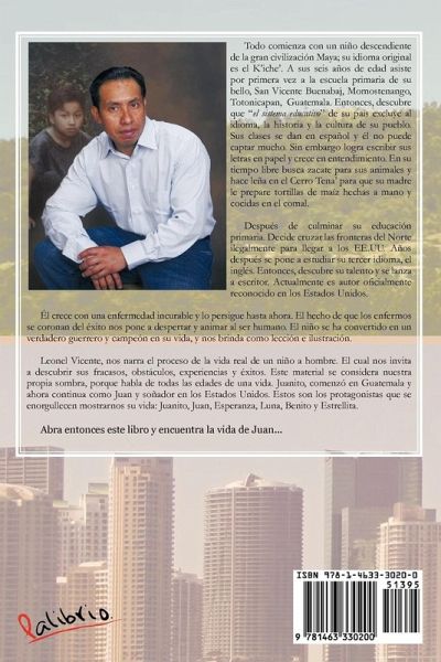 Todo comienza con un niño descendiente de la gran civilización Maya; su idioma original es el K'iche'. A sus seis años de edad asiste por primera vez a la escuela primaria de su bello, San Vicente Buenabaj, Momostenango, Totonicapan, Guatemala. Entonces, descubre que "el sistema educativo" de su país excluye al idioma, la historia y la cultura de su pueblo. Sus clases se dan en español y él no puede captar mucho. Sin embargo logra escribir sus letras en papel y crece en entendimiento. En su tiempo libre busca zacate para sus animales y hace leña en el Cerro Tena' para que su madre le prepare tortillas de maíz hechas a mano y cocidas en el comal. Después de culminar su educación primaria. Decide cruzar las fronteras del Norte ilegalmente para llegar a los EE.UU. Años después se pone a estudiar su tercer idioma, el inglés. Entonces, descubre su talento y se lanza a escritor. Actualmente es autor oficialmente reconocido en los Estados Unidos. Él crece con una enfermedad incurable y lo persigue hasta ahora. El hecho de que los enfermos se coronan del éxito nos pone a despertar y animar al ser humano. El niño se ha convertido en un verdadero guerrero y campeón en su vida, y nos brinda como lección e ilustración. Leonel Vicente, nos narra el proceso de la vida real de un niño a hombre. El cual nos invita a descubrir sus fracasos, obstáculos, experiencias y éxitos. Este material se considera nuestra propia sombra, porque habla de todas las edades de una vida. Juanito, comenzó en Guatemala y ahora continua como Juan y soñador en los Estados Unidos. Estos son los protagonistas que se enorgullecen mostrarnos su vida: Juanito, Juan, Esperanza, Luna, Benito y Estrellita. Abra entonces este libro y encuentra la vida de Juan...