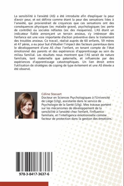 La sensibilité à l'anxiété (AS) a été introduite afin d'expliquer la peur d'avoir peur, et est définie comme étant la peur des sensations liées à l'anxiété, qui proviendrait de croyances que ces sensations ont des conséquences physiques (ex: maladie grave), psychologiques (ex: perte de contrôle) ou sociales néfastes (ex: des moqueries). L'AS étant un indicateur fiable annonçant un terrain anxieux, s'y intéresser dès l'enfance est une voie importante d'action préventive dans le traitement des troubles anxieux. Ce travail, réalisé auprès de 60 enfants, 59 mères et 47 pères, a eu pour but d'étudier l'impact des facteurs parentaux dans le développement d'une AS chez l'enfant, en tenant compte de l'état émotionnel des parents et des expériences d'apprentissage au sein du milieu familial. Les résultats nous montrent que l'AS serait de nature familiale, tant maternelle que paternelle, et influencée par des expériences d'apprentissage catastrophiques. Un lien étroit entre l'utilisation de stratégies de coping de type évitement et une AS élevée a été observé.