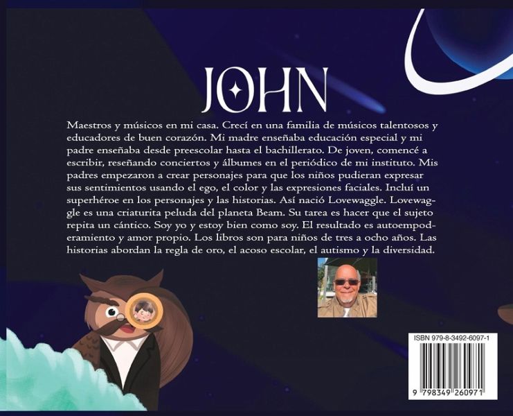 John es un niño que sufre porque otros se burlan de él y lo excluyen. Poco a poco, empieza a perder la confianza en sí mismo. Pero todo cambia cuando Cosmos, el sabio búho del planeta Beam, envía a un Love Waggle lleno de luz y a la alegre Handy Candy, que canta y baila para hacerlo sonreír. Gracias a su apoyo, John descubre su verdadero valor y recupera su felicidad y seguridad interior. Con una historia emotiva y hermosas ilustraciones, John enseña a los niños la importancia del amor propio, la empatía y la fortaleza interior. Una lectura conmovedora para padres, educadores y todos los pequeños que necesitan recordar lo especiales que son.