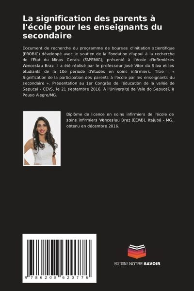Document de recherche du programme de bourses d'initiation scientifique (PROBIC) développé avec le soutien de la Fondation d'appui à la recherche de l'État du Minas Gerais (FAPEMIG), présenté à l'école d'infirmières Wenceslau Braz. Il a été réalisé par le professeur José Vitor da Silva et les étudiants de la 10e période d'études en soins infirmiers. Titre : « Signification de la participation des parents à l'école par les enseignants du secondaire ». Présentation au 1er Congrès de l'éducation de la vallée de Sapucaí - CEVS, le 21 septembre 2016. À l'Université de Vale do Sapucaí, à Pouso Alegre/MG.