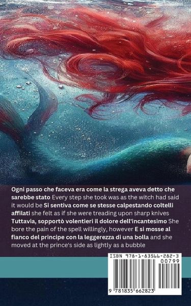 La sirenetta non poté fare a meno di pensare al suo compleanno The little mermaid could not help thinking of her birthday il giorno in cui uscì dal mare per la prima volta the day that she rose out of the sea for the first time Quel giorno si celebravano simili festeggiamenti gioiosi similar joyful festivities were celebrated on that day Pensò alla meraviglia e alla speranza che aveva provato quel giorno she thought about the wonder and hope she felt that day Con quei bei ricordi, anche lei si unì al ballo with those pleasant memories, she too joined in the dance Sui suoi piedi doloranti, si sollevò in aria on her paining feet, she poised herself in the air il modo in cui una rondine si posiziona quando è inseguita da una preda the way a swallow poises itself when in pursued of prey I marinai e i servi la acclamavano meravigliati the sailors and the servants cheered her wonderingly Non aveva mai ballato con tanta grazia prima She had never danced so gracefully before I suoi teneri piedi sembravano tagliati da coltelli affilati Her tender feet felt as if cut with sharp knives ma le importava poco del dolore ai piedi but she cared little for the pain of her feet C'era un dolore molto più acuto che le trafiggeva il cuore there was a much sharper pain piercing her heart