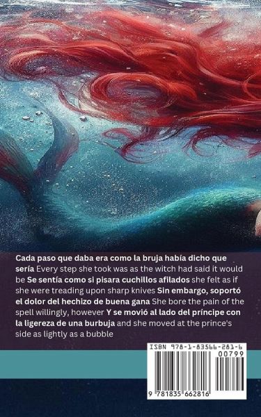 La sirenita no pudo evitar pensar en su cumpleaños The little mermaid could not help thinking of her birthday el día que salió del mar por primera vez the day that she rose out of the sea for the first time Festividades gozosas similares se celebraban en ese día similar joyful festivities were celebrated on that day Pensó en el asombro y la esperanza que sintió ese día she thought about the wonder and hope she felt that day Con esos gratos recuerdos, ella también se unió al baile with those pleasant memories, she too joined in the dance Sobre sus pies doloridos, se balanceó en el aire on her paining feet, she poised herself in the air la forma en que una golondrina se equilibra cuando es perseguida por una presa the way a swallow poises itself when in pursued of prey Los marineros y los sirvientes la vitoreaban con asombro the sailors and the servants cheered her wonderingly Nunca antes había bailado con tanta gracia She had never danced so gracefully before Sus tiernos pies se sentían como si hubieran sido cortados con cuchillos afilados Her tender feet felt as if cut with sharp knives pero poco le importaba el dolor de sus pies but she cared little for the pain of her feet Había un dolor mucho más agudo que le atravesaba el corazón there was a much sharper pain piercing her heart