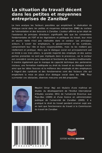 Le livre analyse les facteurs possibles qui empêchent la réalisation du dialogue social dans les petites et moyennes entreprises (PME) du secteur de l'alimentation et des boissons à Zanzibar. L'auteur affirme qu'en dépit de l'existence de principes directeurs significatifs tels que les conventions fondamentales de l'OIT et les législations et politiques du travail, leur mise en oeuvre réelle n'est pas réalisable dans ce secteur. Les principaux acteurs, à savoir les employeurs, le gouvernement et les syndicats, comprennent leur rôle et leurs responsabilités, mais ne les mettent pas réellement en pratique. Alors que le dialogue social est principalement axé et limité à ces trois piliers, la grande majorité des employés et des autres parties prenantes ne sont pas impliqués dans le processus, car le secteur est considéré comme peu important et fonctionne de manière traditionnelle. Il montre également que le manque de capacité technique des partenaires sociaux, une formation inadéquate au droit du travail et au dialogue social, ainsi que les idées fausses et la méfiance des employés et des employeurs à l'égard des syndicats et des fonctionnaires sont des facteurs clés qui empêchent la mise en place d'un dialogue social dans les PME. Pour surmonter ces obstacles, diverses mesures ont été proposées.