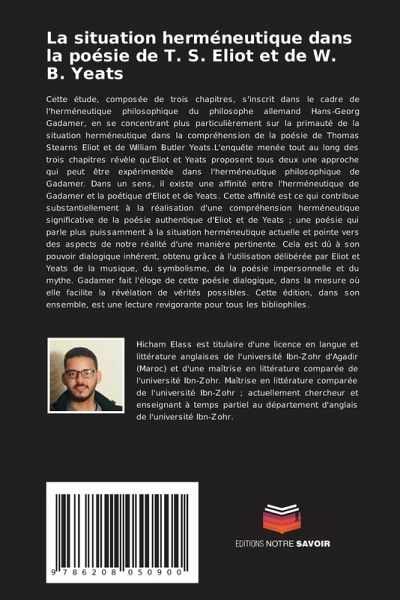 Cette étude, composée de trois chapitres, s'inscrit dans le cadre de l'herméneutique philosophique du philosophe allemand Hans-Georg Gadamer, en se concentrant plus particulièrement sur la primauté de la situation herméneutique dans la compréhension de la poésie de Thomas Stearns Eliot et de William Butler Yeats.L'enquête menée tout au long des trois chapitres révèle qu'Eliot et Yeats proposent tous deux une approche qui peut être expérimentée dans l'herméneutique philosophique de Gadamer. Dans un sens, il existe une affinité entre l'herméneutique de Gadamer et la poétique d'Eliot et de Yeats. Cette affinité est ce qui contribue substantiellement à la réalisation d'une compréhension herméneutique significative de la poésie authentique d'Eliot et de Yeats ; une poésie qui parle plus puissamment à la situation herméneutique actuelle et pointe vers des aspects de notre réalité d'une manière pertinente. Cela est dû à son pouvoir dialogique inhérent, obtenu grâce à l'utilisation délibérée par Eliot et Yeats de la musique, du symbolisme, de la poésie impersonnelle et du mythe. Gadamer fait l'éloge de cette poésie dialogique, dans la mesure où elle facilite la révélation de vérités possibles. Cette édition, dans son ensemble, est une lecture revigorante pour tous les bibliophiles.
