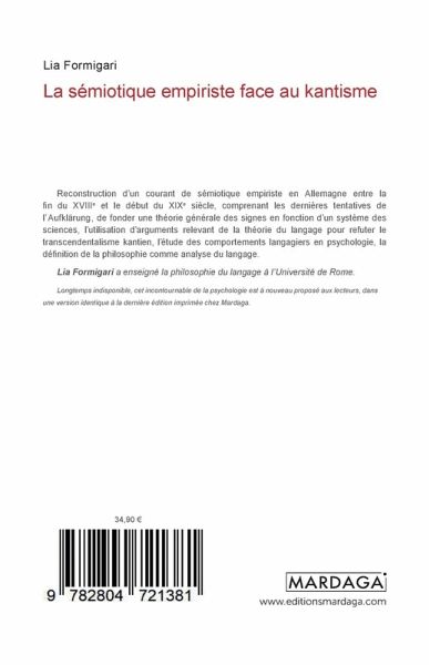 Reconstruction d¿un courant de sémiotique empiriste en Allemagne entre la fin du XVIIIe et le début du XIXe siècle, comprenant les dernières tentatives de l¿Aufklärung, de fonder une théorie générale des signes en fonction d¿un système des sciences, l¿utilisation d¿arguments relevant de la théorie du langage pour refuter le transcendentalisme kantien, l¿étude des comportements langagiers en psychologie, la définition de la philosophie comme analyse du langage. Lia Formigari a enseigné la philosophie du langage à l¿Université de Rome.