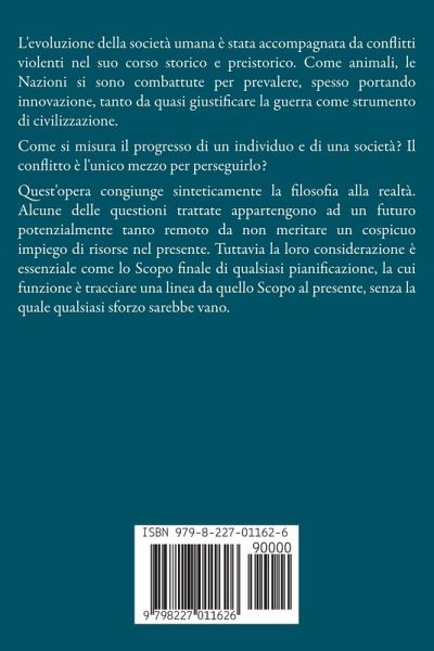 L'evoluzione della società umana è stata accompagnata da conflitti violenti nel suo corso storico e preistorico. Come animali, le Nazioni si sono combattute per prevalere, spesso portando innovazione, tanto da quasi giustificare la guerra come strumento di civilizzazione. Come si misura il progresso di un individuo e di una società? Il conflitto è l'unico mezzo per perseguirlo? Quest'opera congiunge sinteticamente la filosofia alla realtà. Alcune delle questioni trattate appartengono ad un futuro potenzialmente tanto remoto da non meritare un cospicuo impiego di risorse nel presente. Tuttavia la loro considerazione è essenziale come lo Scopo finale di qualsiasi pianificazione, la cui funzione è tracciare una linea da quello Scopo al presente, senza la quale qualsiasi sforzo sarebbe vano.