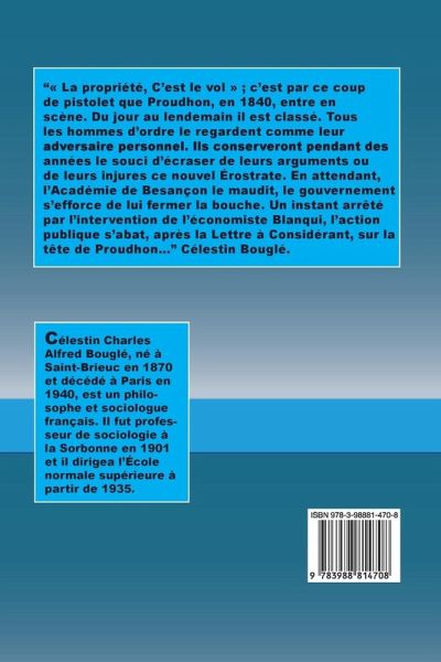 " La propriété, C'est le vol ; c'est par ce coup de pistolet que Proudhon, en 1840, entre en scène. Du jour au lendemain il est classé. Tous les hommes d'ordre le regardent comme leur adversaire personnel. Ils conserveront pendant des années le souci d'écraser de leurs arguments ou de leurs injures ce nouvel Érostrate. En attendant, l'Académie de Besançon le maudit, le gouvernement s'efforce de lui fermer la bouche. Un instant arrêté par l'intervention de l'économiste Blanqui, l'action publique s'abat, après la Lettre à Considérant, sur la tête de Proudhon..." Célestin Bouglé.