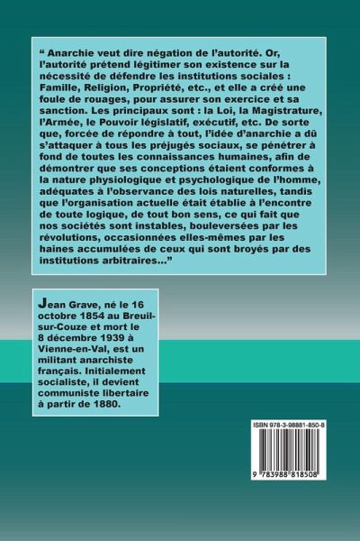 " Anarchie veut dire négation de l'autorité. Or, l'autorité prétend légitimer son existence sur la nécessité de défendre les institutions sociales : Famille, Religion, Propriété, etc., et elle a créé une foule de rouages, pour assurer son exercice et sa sanction. Les principaux sont : la Loi, la Magistrature, l'Armée, le Pouvoir législatif, exécutif, etc. De sorte que, forcée de répondre à tout, l'idée d'anarchie a dû s'attaquer à tous les préjugés sociaux, se pénétrer à fond de toutes les connaissances humaines, afin de démontrer que ses conceptions étaient conformes à la nature physiologique et psychologique de l'homme, adéquates à l'observance des lois naturelles, tandis que l'organisation actuelle était établie à l'encontre de toute logique, de tout bon sens, ce qui fait que nos sociétés sont instables, bouleversées par les révolutions, occasionnées elles-mêmes par les haines accumulées de ceux qui sont broyés par des institutions arbitraires..."