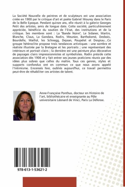 La Société Nouvelle de peintres et de sculpteurs est une association créée en 1900 par le critique d'art et poète Gabriel Mourey dans le Paris de la Belle Epoque. Pendant quinze ans, elle réunit à la galerie Georges Petit des artistes, amis de longue date. Cette société, particulièrement appréciée, bénéficie du soutien de l'Etat, des institutions et de la critique. Ses membres sont : La "Bande Noire", Le Sidaner, Martin, Blanche, Claus, La Gandara, Rodin, Meunier, Bartholomé, Desbois, Bourdelle, Maillol, les Schnegg, Dejean, Poupelet et Despiau...Ce groupe hétéroclite propose trois tendances artistiques : une sombre et réaliste illustrée par la Bretagne et les portraits ; une représentant des intérieurs et portrait clairs ; la dernière est une peinture plus décorative de paysages clairs impressionnistes et symbolistes. Rodin préside cette association dès 1906 et y fait entrer ses jeunes praticiens réunis par des idées plus sobres que celles du maître. Tous ces genres, styles et supports confondus ont en commun ce que nous avons appelé l'Intimisme. Encensés hier, oubliés aujourd'hui, ce travail permettra peut-être de réhabiliter ces artistes de talent.